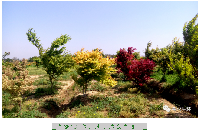 傳統(tǒng)色塊,無非綠,紅,黃三種顏色,“金禧”從萌芽到葉片成熟綻放,會(huì)經(jīng)歷多個(gè)變色階段,所以色塊隨著新葉的生長(zhǎng),會(huì)呈現(xiàn)多種色彩效果,并且層次遞進(jìn)是其他任何色塊苗木無法比擬的。