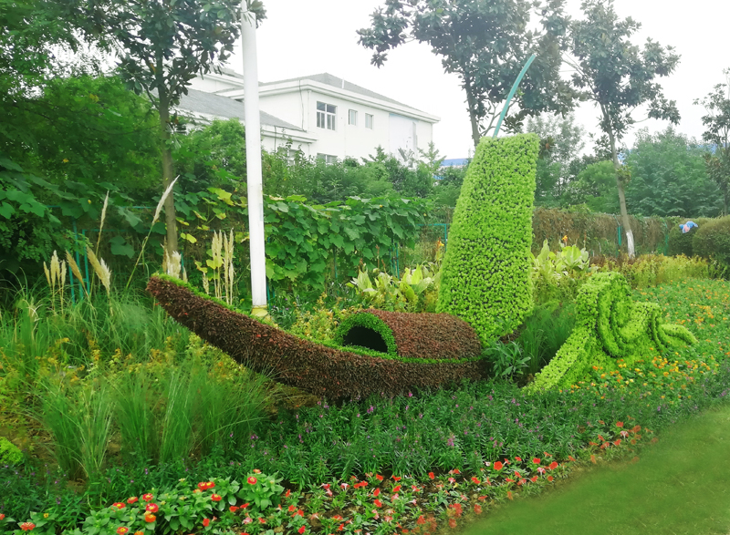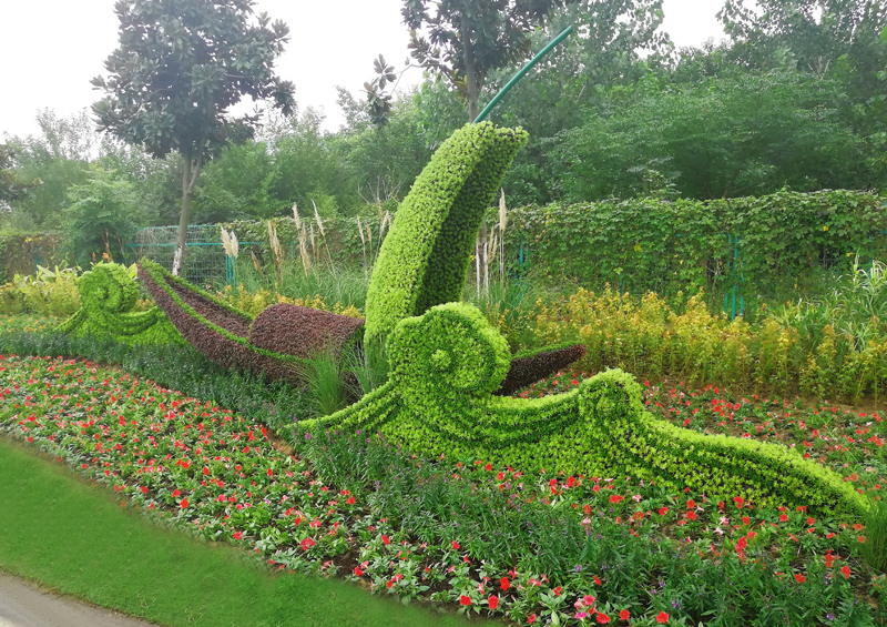 美麗清純的洪澤湖以水產(chǎn)聞名,有蟹都之稱。高速出口東側(cè)的“美好洪澤·揚(yáng)帆遠(yuǎn)航”綠雕占地1332㎡,以生態(tài)優(yōu)先、綠色發(fā)展為主題,通過彩繪洪澤的自然環(huán)境,人文景觀,體現(xiàn)生態(tài)、和諧、活力的畫面。寓意城市的未來潛力無限,明天會更加美好。綠雕主體鋼結(jié)構(gòu)組成,高5.2米,整體場景約60米。