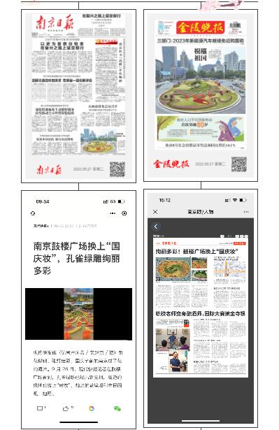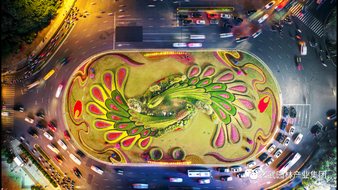 以“喜迎二十大,奮進(jìn)新征程”為設(shè)計(jì)主題;在保留孔雀主體綠雕的情況下,圍繞其四周采用繽紛的造型花柱、飄揚(yáng)的紅旗、科技感的“城市背景”及精致飄逸的植物花帶結(jié)合,演繹百年征程、筑夢未來?;◣г煨蛢?nèi)含“2022”亮化展示,“城市背景”展現(xiàn)在飄揚(yáng)的紅旗上,表達(dá)南京人民喜迎黨的二十大勝利召開,也展現(xiàn)了在黨的堅(jiān)強(qiáng)領(lǐng)導(dǎo)下人民奮進(jìn)新征程,建功新時(shí)代的豪情和信心。